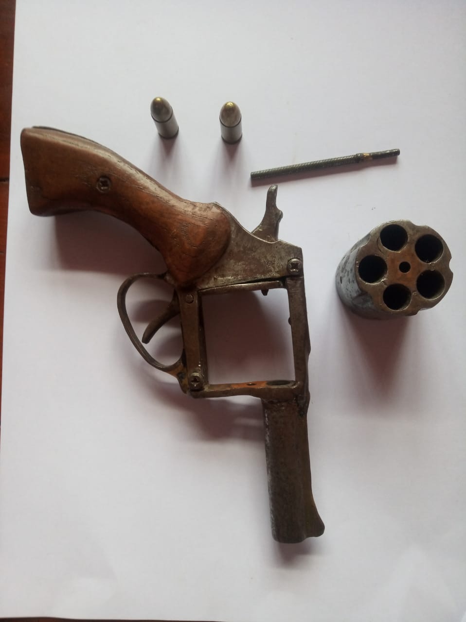 1. 1(satu) pucuk senjata api rakitan Revolver warna cokelat dengan gagang coklat dengan amunisi 2 ( butir ) peluru aktif Caliber 6 MM.