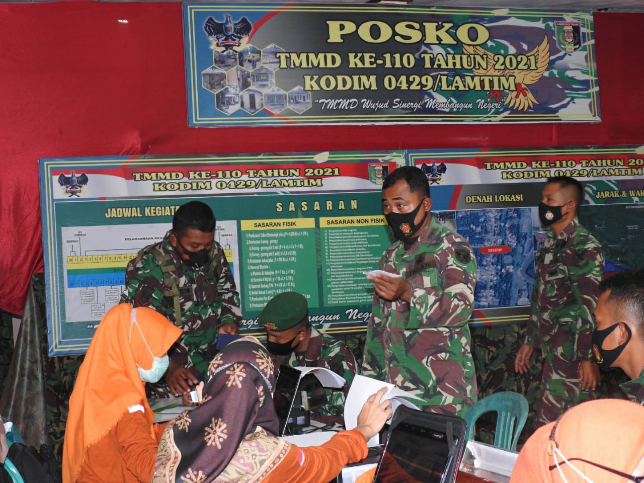 Lampung Timur, (radarnews.id)-Sebanyak 80 Personil Satuan Tugas (Satgas) TNI Manunggal Membangun Desa (TMMD) Kodim 0429/Lamtim menerima vaksinasi COVID-19 tahap kedua, kegiatan berlangsung di Posko TMMD, Desa Sukorahayu, Kecamatan Lqbuhan Maringgai, Lampung Timur, Jum’at (26/3/2021).