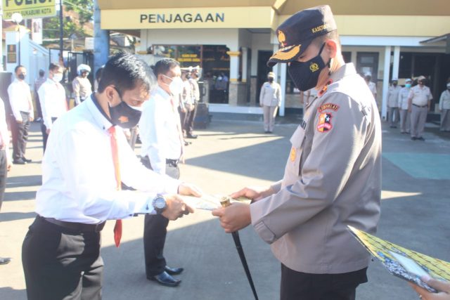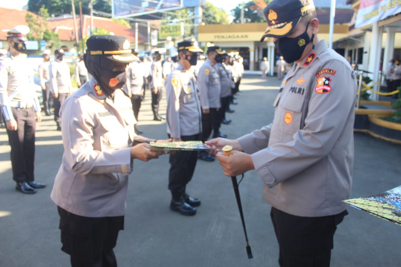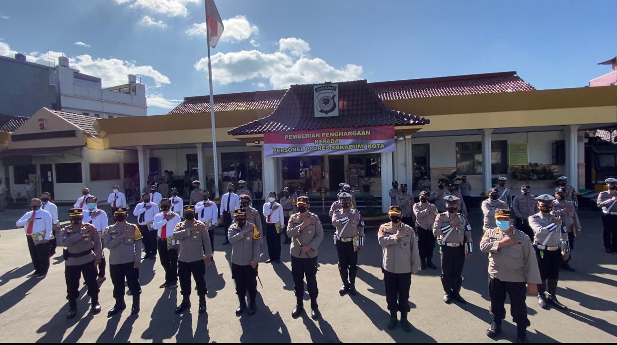 Sukabumi, (radarnews.id) – Pasca terlibat dalam pembuatan film pembelajaran “Manajemen Polsek”. Sebanyak 55 anggota dari Polres Sukabumi Kota Polda Jabar meraih penghargaa. Penghargaan tersebut diberikan langsung oleh Kasetukpa Lemdiklat Polri Brigjen Pol Mardiaz Kusin Dwihananto di halaman Mapolres Sukabumi Kota Polda Jabar, Kamis (08/04/2021).