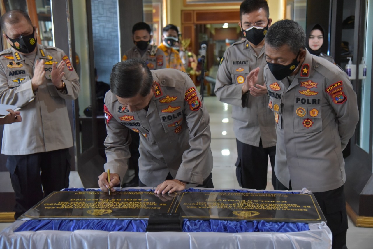 Bandar Lampung-Kapolda Lampung Irjen Pol Hendro Sugiatno dan Waka Polda Lampung Brigjen Pol Subiyanto Menghadiri Pelaksanaan Peresmian gedung baru Rawat Inap dan gedung Laboratorium PCR Rumah sakit Bhayangkara TK.III Polda Lampung melaluiĀ Zoom Meeting di Siger Lounge Mapolda, Senin (12/4/2021)