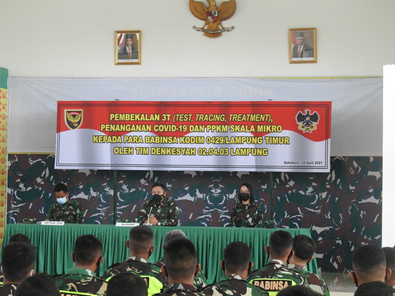 Lampung Timur,(radarnews.id)-Kegiatan pembekalan 3T (Test,Tracing dan Treatment) dan Pemberlakuan Pembatasan Kegiatan Masyarakat (PPKM) skala mikro oleh tim dari Denkesyah 02.04.03 Bandar Lampung berlangsung di Aula Makodim 0429/Lamtim Jl. Soekarno Hatta, Desa Mataram Marga, Kecamatan Sukadana, Kabupaten Lampung Timur, Rabu (28/4/2021).
