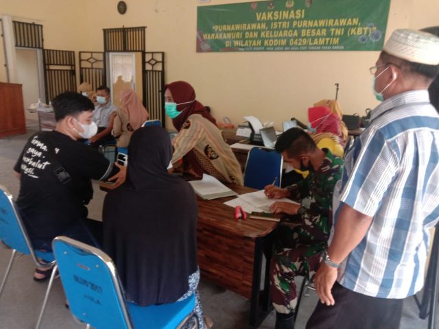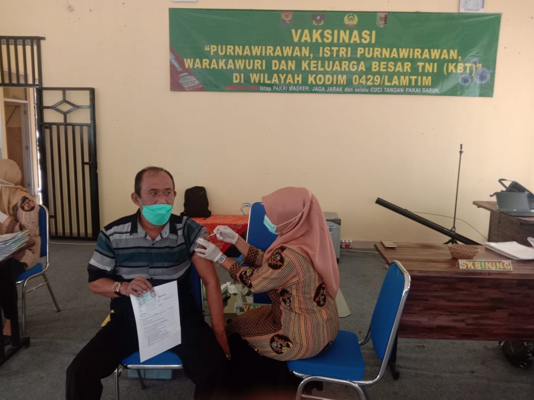 Dandim 0429/Lamtim Letkol Kav. Muhammad Darwis melalui Pasiop mengatakan,”pemberian vaksin kepada Purnawirawan, pensiunan PNS, Warakawuri dan KBT Kodim 0429/Lamtim merupakan tindak lanjut perintah langsung dari Komando atas guna memutus penyebaran Covid- 19 yang muncul pada tahun 2019 lalu,” terangnya.