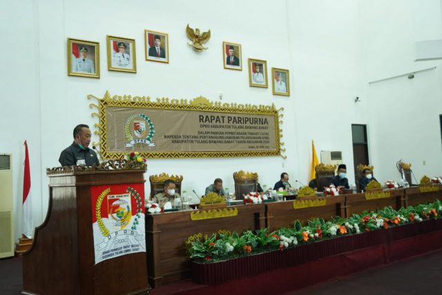 Tubaba, (Radar news.id)-Rapat Paripurna DPRD Kabupaten Tulang Bawang Barat dalam rangka Pembicaraan Tingkat I atas Raperda tentang Pertanggung Jawaban Pelaksanaan APBD Kabupaten Tulang Bawang Barat TA 2020, di Ruang Paripurna DPRD setempat. Rabu (02/06).