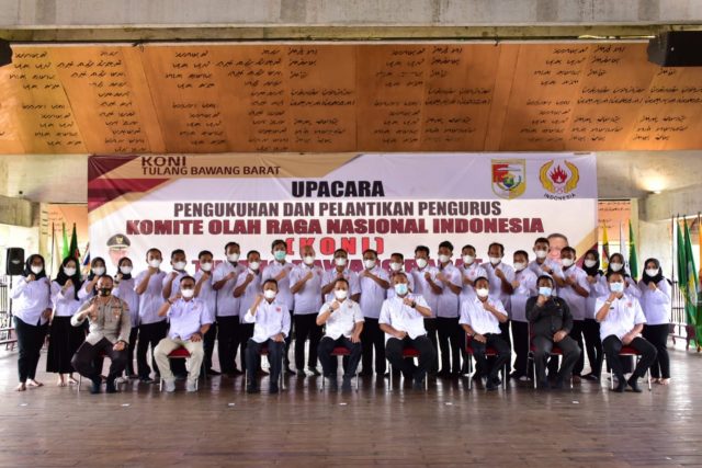 Tubaba,(Radar news.id)-Bupati Tulang Bawang Barat Umar Ahmad, SP memberikan sambutan pada upacara pengukuhan dan pelantikan pengurus Komite Olahraga Nasional Indonesia (KONI ) Tubaba di sesat agung komplek islamic center. Panaragan, Rabu (16/06 ).