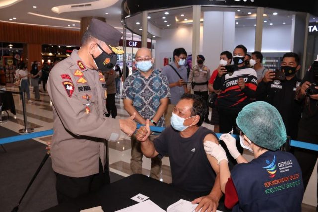Palembang ,(radarnews.id)- Kapolda Sumsel Irjen Pol Prof Dr Eko Indra Heri,S MM menyambangi Masyarakat Kota Palembang mengikuti vaksinasi Covid 19 diPasar Modern Palembang Icon Palembang, Selasa (15/06/2021) .