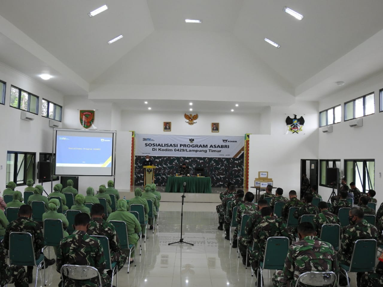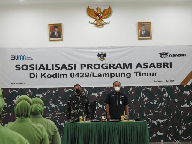 Lampung Timur,(radarnews.id)- Prajurit Kodim 0429/Lamtim, PNS dan perwakilan Persit KCK Cab. LIV menerima sosialisasi dari PT Asabri (Persero) bertempat di Aula Kodim, Jl. Soekarno-Hatta, Desa Mataram Marga Kecamatan Sukadana, Lampung Timur, Rabu (30/6/2021).