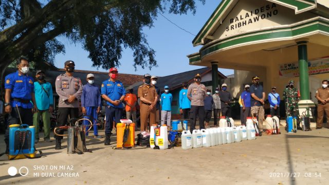 Lampung Timur, (Radarnews.id)-Personil yang tergabung dalam Satuan Tugas (Satgas) penanganan Covid-19 dan Pemberlakuan Pembatasan Kegiatan Masyarakat (PPKM) Kecamatan Bandar Sribhawono kembali melaksanakan penyemprotan cairan disinfektan, Selasa (27/7/2021).