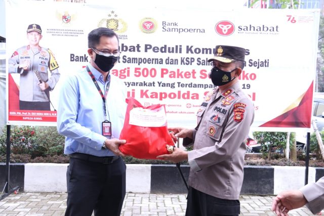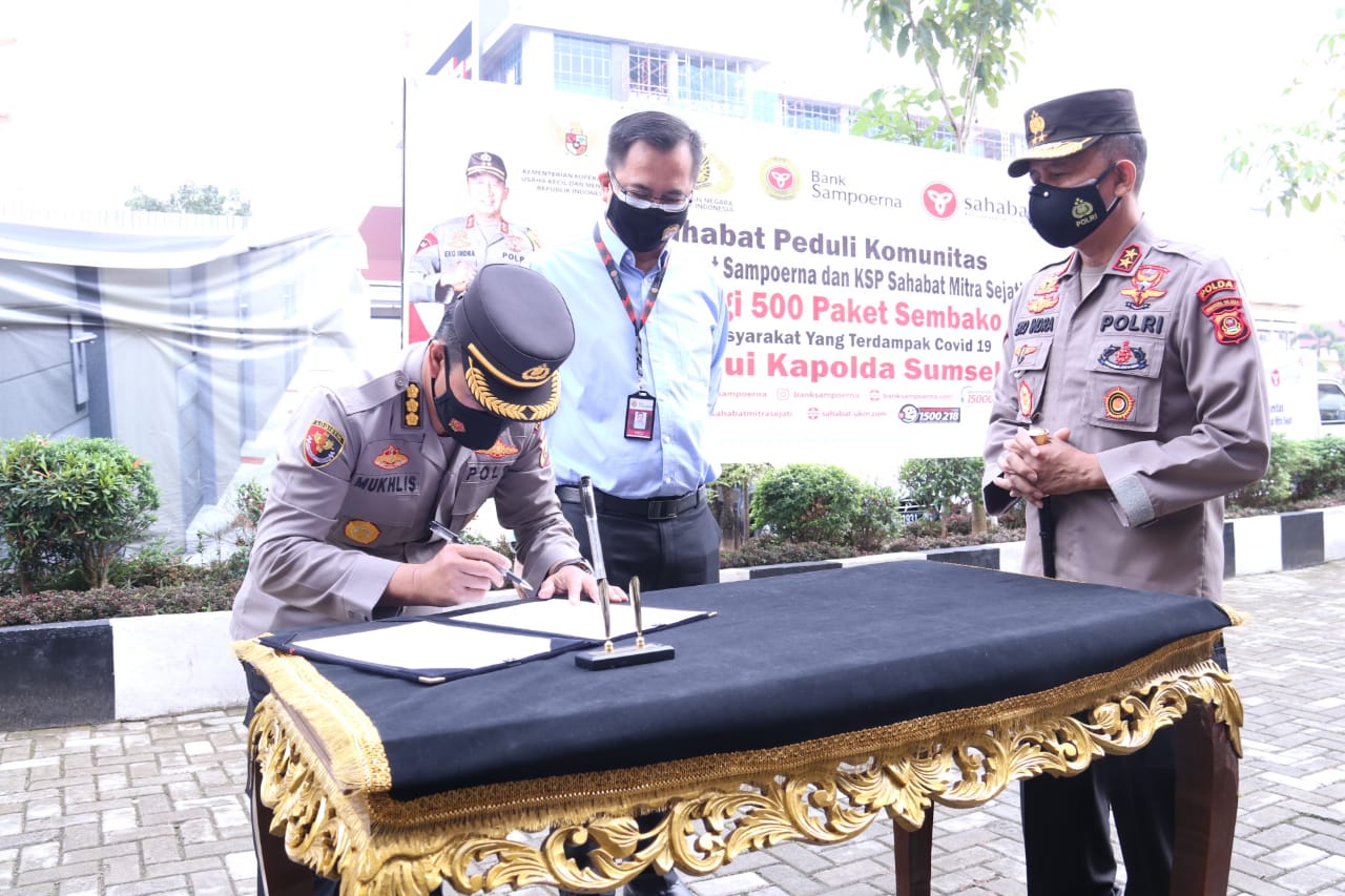 PALEMBANG, (radar news.id)- Kapolda Sumatera Selatan (Sumsel), Irjen Pol Prof Dr Eko Indra Heri S MM didampingi Wakapolda Sumsel Brigjen Pol.Rudi Setiawan Sik SH MH dan PJU Polda Sumsel terima secara simbolis Bantuan Paket Sembako dari Bank Sahabat Sempurna Palembang diLobby Gedung Promoter Mapolda Sumsel, Senin (23/8).