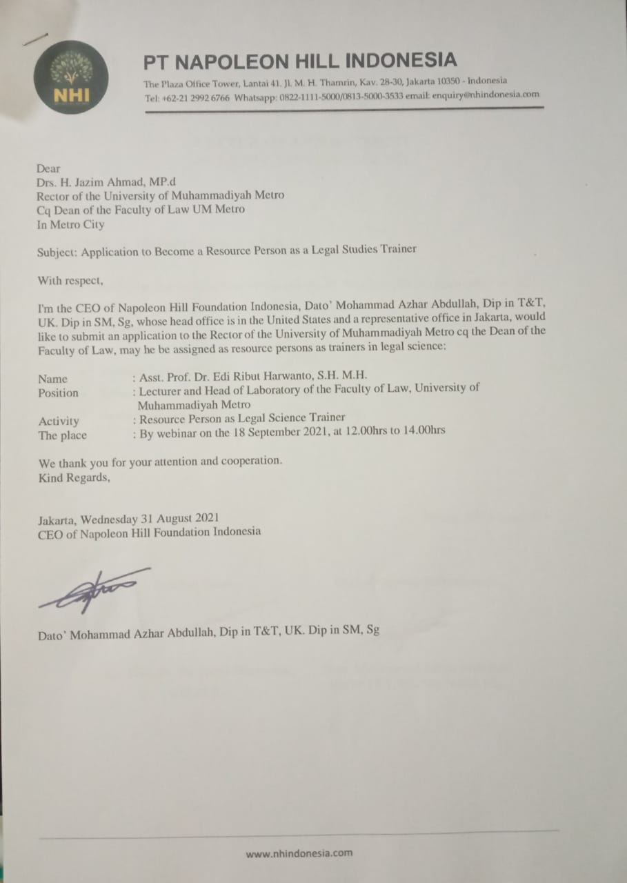 Jakarta,(radarnews.id)-Dato Mohammad Azhar Abdullah warga negara Singapura sebagai pemegang lisensi/ franchisee CEO Napoleon Hill Indonesia (NHI) yang berkantor pusat di Amerika Serikat, memohon kepada Rektor Universitas Muhammadiyah Metro untuk untuk menugaskan Dosen Ahli Hukum Pidana Ekonomi dan Hak Kekayaan Intelektual Fakultas Hukum Asst. Prof. Dr. Edi Ribut Harwanto, S.H.,M.H., salah satu trainer berkompeten diakui secara internasional ber-certifiet trainer ref.001/NHL/_TRN-LOA/VIII/L/2021 dari Napoleon Hill Fondation dalam kegiatan training motivator 17 prinsip kesuksesan di Jakarta yang akan digelar 18 September 2021 selama 14 hari.