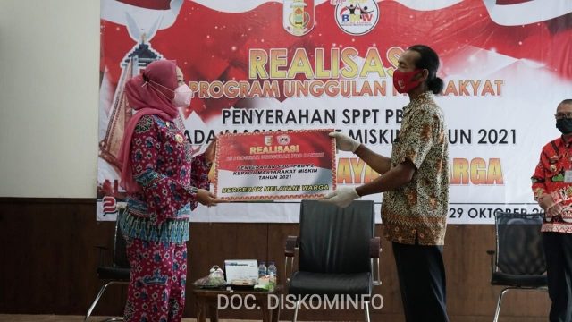 TUBA,(Radarnews.id)-Bupati Tulang bawang Dr. hj. Winarti S.E. M.H. menyerahkan Realisasi 25 program unggulan Pro rakyat SPPT PBB-P2 Kepada masyarakat miskin Thn 2021 melalui daring zoom meeting, diruang rapat kantor bupati tulang bawang,jum’at (29/10/2021).