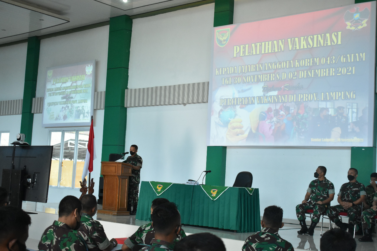 Kepala staf Korem 043/Gatam (Kasrem) Kolonel Inf. Dendi Suryadi S.H,.M.H., pada saat membacakan sambutan Danrem dalam acara pembukaan pelatihan vaksinasi menyampaikan, “Kita ketahui bersama, bahwa pandemi covid-19 di negara kita tidak terkecuali di wilayah provinsi lampung, hingga saat ini belum dapat dipastikan kapan akan berakhir. Hal ini berdampak terhadap dunia pendidikan, kehidupan sosial dan segmen kehidupan lainnya”.