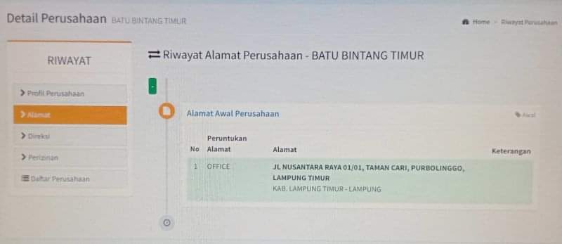 Metro Lampung,(Radarnews.id)- PT Batu Bintang Timur diduga telah melakukan pembohongan Publik, dengan cara membuat alamat Perusahaan Pertambangannya di Kabupaten Lampung Timur tepatnya di Jalan Nusantara Raya, RT/RW, 001/001 Desa Suka Cari Kecamatan Purbolinggo, Kabupaten Lampung Timur Propinsi Lampung.(8/12/2021).