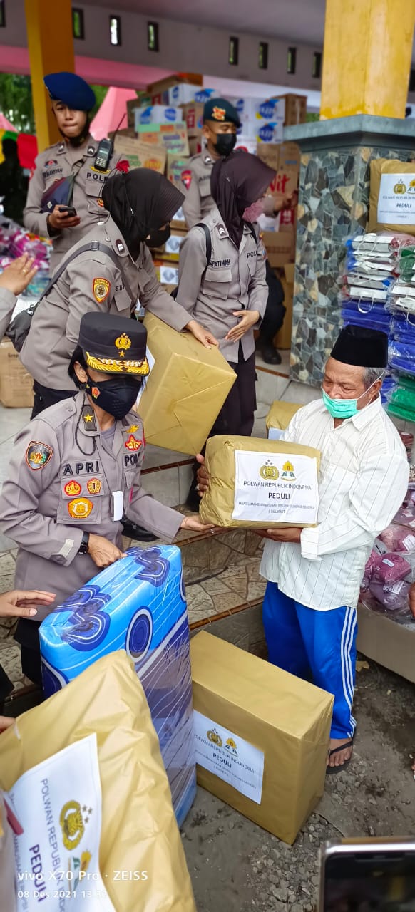 Lumajang,(Radarnews.id)Polisi Wanita (Polwan) bergerak membantu korban bencana erupsi Gunung Semeru dengan menyalurkan bantuan sosial (Bansos) serta menggelar trauma healing.