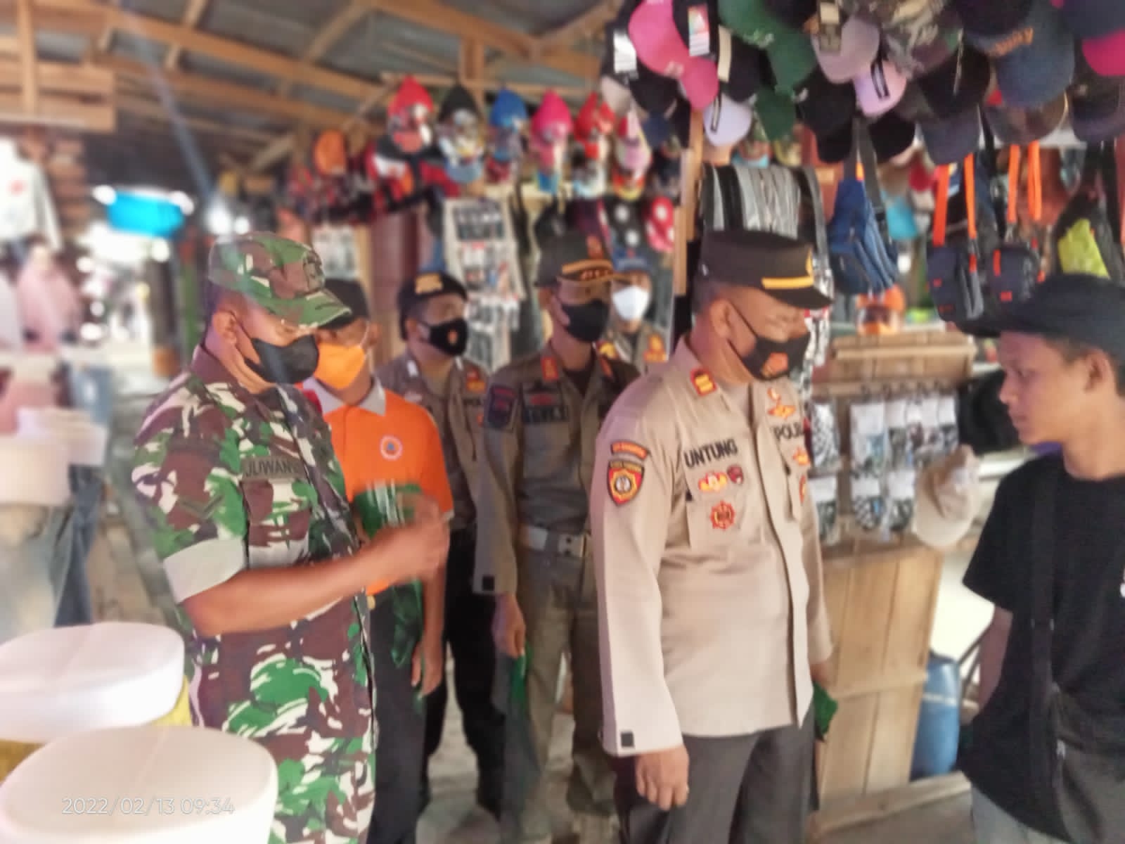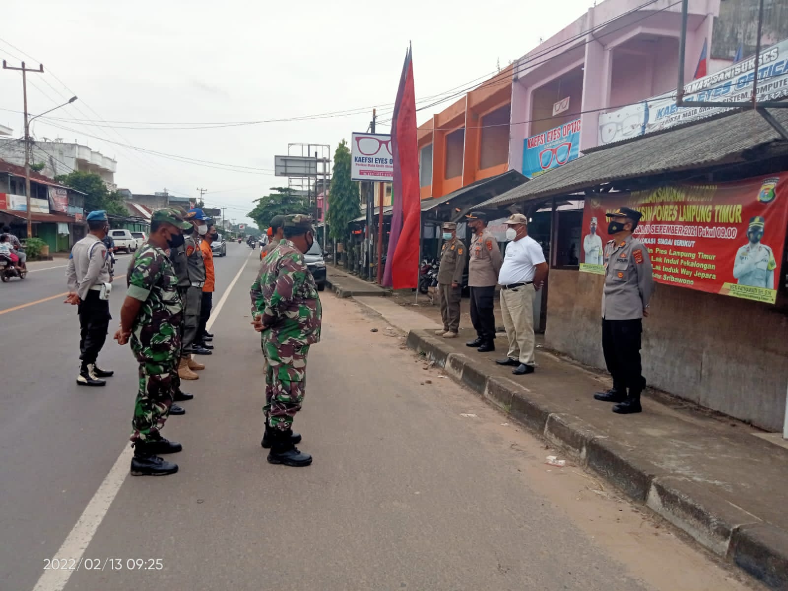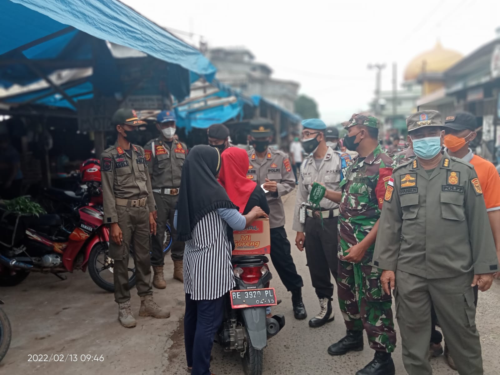 Lampung Timur, , (radarnews.id)- Antisipasi angka penyebaran covid-19 di wilayah Kabupaten Lampung Timur, personel gabungan yang terdiri dari TNI, Polri dan Satpol PP serta instansi terkait laksanakan operasi yustisi dan pembagian masker gratis di Pasar Way Jepara, Minggu (13/2/2022).