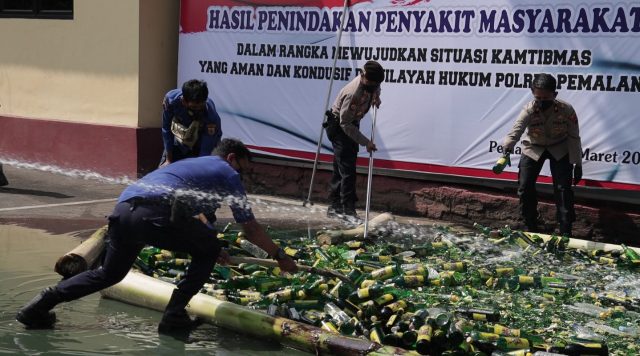 Pemalang, (radar news.id) – Menjelang bulan ramadhan, Polres Pemalang melaksanakan pemusnahan barang bukti hasil penindakan penyakit masyarakat (pekat) di wilayah Kabupaten Pemalang, ribuan botol minumas keras (miras) dan obat keras dimusnahkan di halaman Mapolres Pemalang, Kamis (31/03/2022).