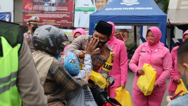 Pemalang, (radarnews.id)-Polres Pemalang berbagi takjil kepada pemudik yang melintas di depan Pos Pengamanan (Pospam) Gandulan dan Pos Pelayanan (Posyan) Alun-alun Kabupaten Pemalang, sebanyak 500 bingkisan takjil dibagikan menjelang waktu berbuka puasa, Senin (25/4/2022) sore.