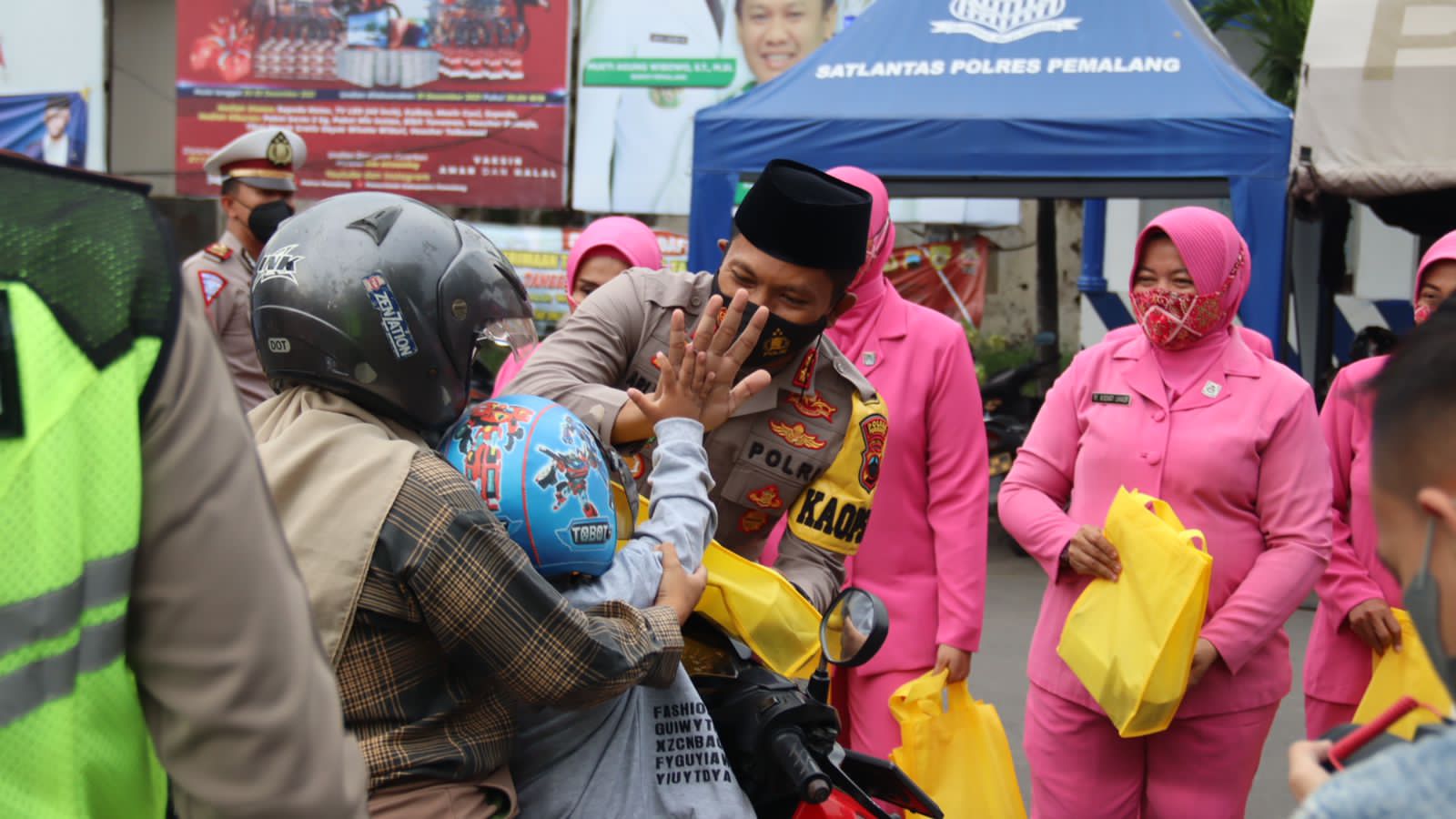 Didampingi pejabat utama Polres Pemalang dan pengurus cabang Bhayangkari Pemalang, Kapolres Pemalang AKBP Ari Wibowo berbagi takjil untuk pemudik dan masyarakat sekitar di depan Posyan Alun-Alun Kabupaten Pemalang.