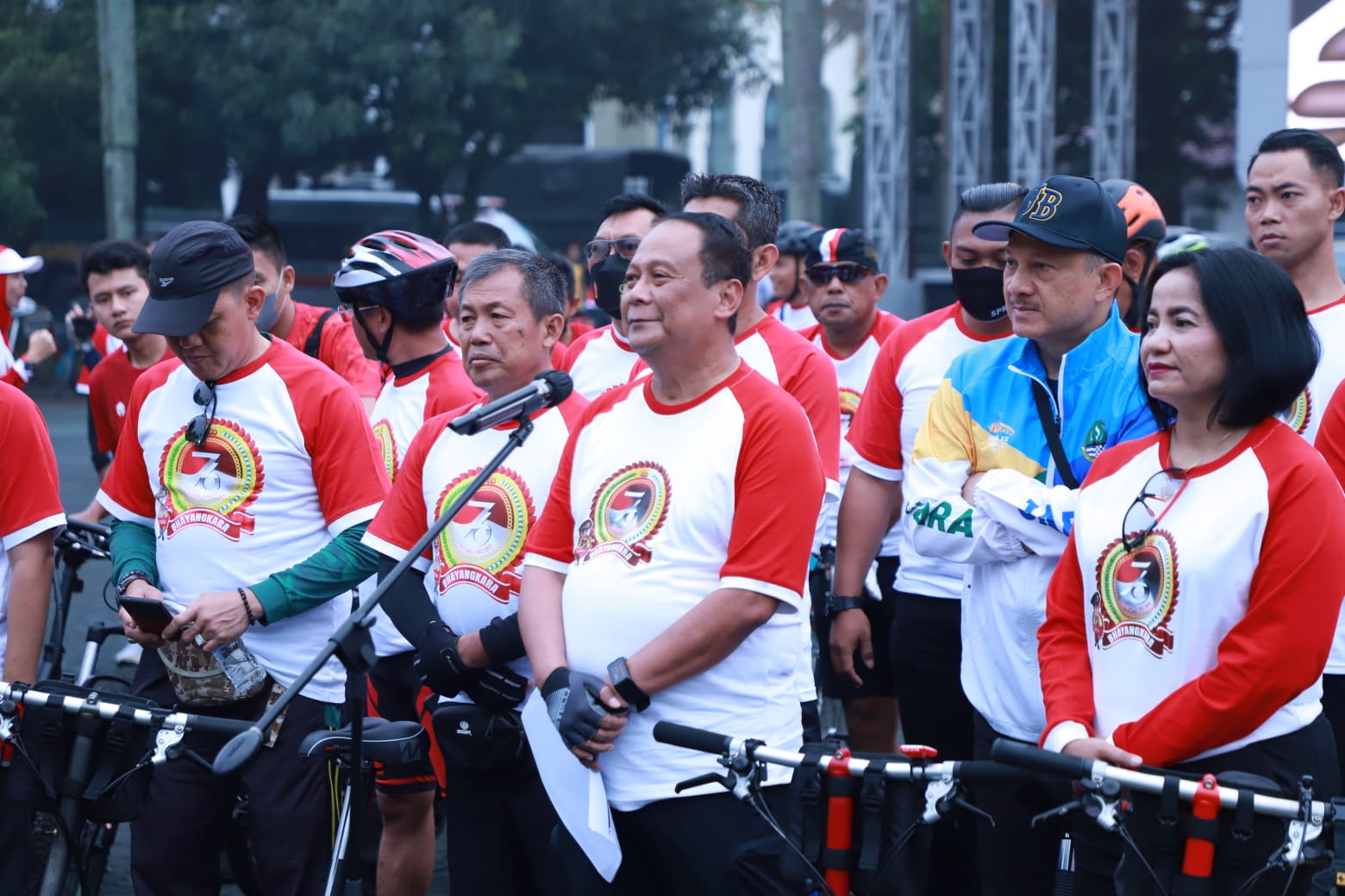 Bandung, (radarnews.id)-Dalam rangka memperingati HUT Bhayangkara ke – 76 Kapolda Jabar Irjen Pol. Drs. Suntana M.Si didampingi Wakapolda Jabar, Pejabat Utama Polda Jabar, Sekda Prov Jabar, Kasdam III/Siliwangi, Dan Lanal Bandung, Dan Lanud Husen Sastranegara, Ketua Bhayangkari Daerah Jabar beserta pengurus serta undangan lainnya melaksanakan olah raga sepeda santai dan senam aerobic, Minggu (19/6/2022).