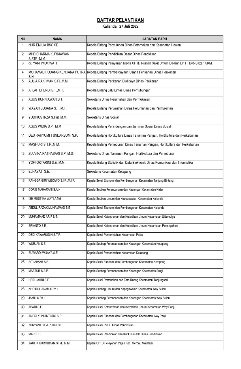 Sementara, pelantikan itu berdasarkan Surat Keputusan Bupati Lampung Selatan Nomor 821.23/527/V.05/2022 dan Nomor 821.24/528/V.05/2022 tentang Pemberhentian, Pemindahan dan Pengangkatan Pegawai Negeri Sipil Dalam Jabatan Administrator/Eselon III dan Pengawas/Eselon IV Dilingkungan Pemerintah Kabupaten Lampung Selatan.
