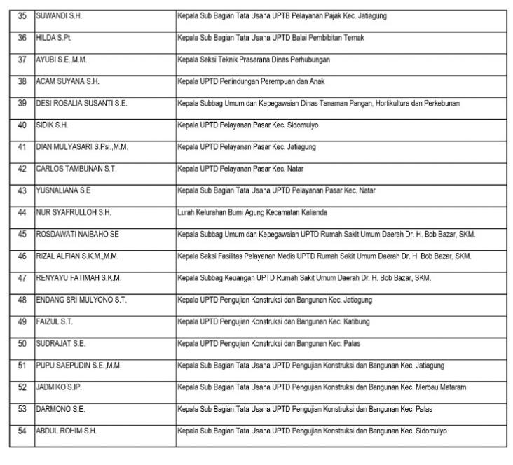 Adapun pelantikan dan pengambilan sumpah 54 orang pejabat struktural tersebut dilakukan oleh Sekretaris Daerah (Sekda) Kabupaten Lampung Selatan Thamrin, S.Sos, MM, bertempat di Aula Rajabasa, kantor bupati setempat, Rabu pagi (27/07/2022).