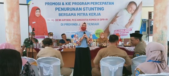 TEGAL, (radarnews.id) – Anggota Komisi IX DPR RI Fraksi PDI Perjuangan Dr. Dewi Aryani, M.Si tak henti-hentinya turun langsung ke desa-desa dalam rangka menekan angka stunting di wilayah Kabupaten Tegal. Kali ini DeAr sapaan akrabnya mengunjungi dan melakukan sosialisasi kegiatan Promosi & KIE Program Percepatan Penurunan Stunting Bersama Mitra Kerja di Desa Lembahsari Kecamatan Jatinegara Kabupaten Tegal, Selasa (30/8/2022).