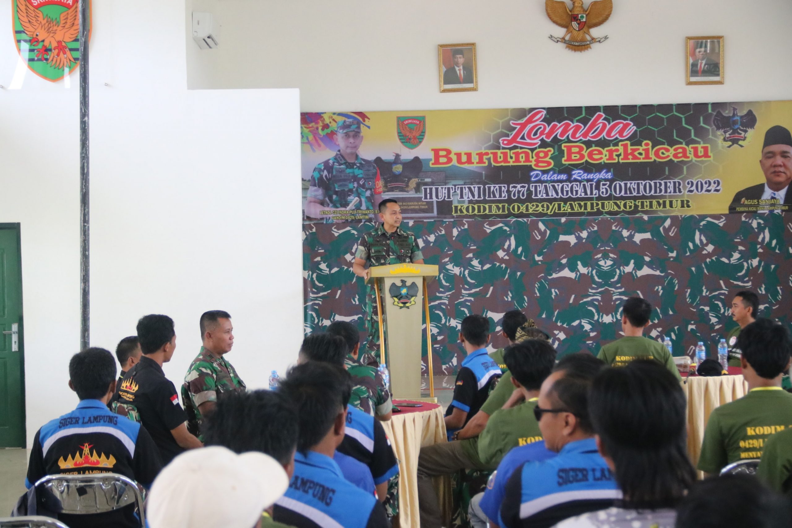 LAMPUNG TIMUR, (radarnews.id)-Dalam rangka menyambut sekaligus memeriahkan Hari Ulang Tahun (HUT) TNI Ke-77, Kodim 0429/Lamtim menggelar perlombaan burung kicau, bertempat di Aula Gatot Soebroto Makodim, Jl. Soekarno-Hatta, Desa Mataram Marga Kecamatan Sukadana, Kabupaten Lampung Timur, Minggu (25/9/2022).Dalam sambutanya Dandim 0429/Lamtim Letkol Czi. Indra Puji Triwanto, SH menyampaikan ucapan selamat datang dan terima kasih kepada para undangan, panitia penyelenggara dan seluruh peserta lomba yang sudah hadir berpartisipasi memeriahkan lomba burung kicau dalam rangka HUT TNI Ke-77.“Selain untuk mengenalkan lebih luas kepada masyarakat Lampung Timur bahwa sudah berdiri Kodim baru. Ajang yang di gelar adalah untuk memeriahkan Hari Ulang Tahun Ke-77 tepatnya Tanggal 5 Oktober 2022, yang merupakan wujud nyata kemanunggalan TNI dengan Rakyat dalam kegiatan yang positif dan bermanfaat”, ujar Dandim.“Ini even perdana yang dilaksankan oleh Kodim 0429/Lamtim. Harapanya kedepan kegiatan ini bisa terus berlanjut sehingga para pecinta kicau mania baik dari Lampung Timur maupun luar daerah hobinya bisa terwadahi”.Lanjut Dandim,”aspek lain tujuan dari acara Ini selain sekedar hobby/Kesenangan, masyarakat bisa memanfaatkan peluang usaha dari memelihara atau beternak burung sehingga membantu menaikan ekonomi/ kesejahteraan masyarakat. Selamat berlomba dan jaga Sportifitas!”, tegas Dandim. Sementara ketua kicau mania Lampung Timur Yosi Suwandi, SH mewakili rekan-rekan penghobi burung sangat mengapresiasi Kodim 0429/Lamtim berkat terselenggaranya kegiatan tersebut.