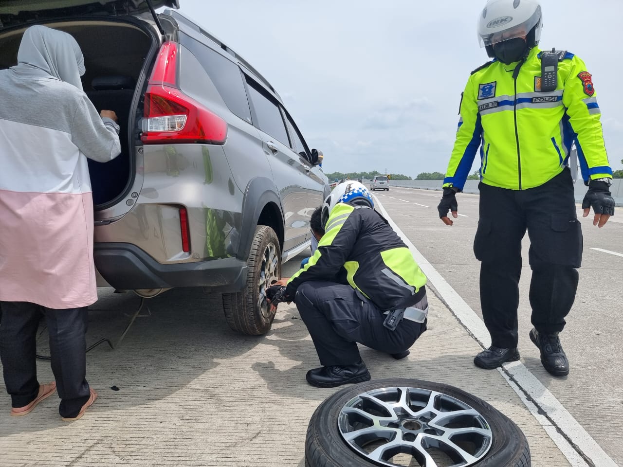 Dalam melaksanakan Patroli Tim Urai mendapati pemudik yang mengalami pecah ban di ruas jalan tol KM 274. Sudah sebagaian tugas kami untuk membantu pemudik menggantikan ban yang pecah di KM 274 yang bertujuan dari Tanggerang – Solo,” ungkap Iptu Teguh.