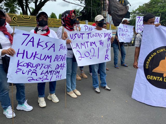 Bandarlampung,(radarnews.id)- LSM Gerakan Cinta Lampung Timur orasi di depan Kantor Kejaksaan Tinggi Tanjung Karang propinsi Lampung, Rabu (25/1/2023) Dalam aksi Tersebut Fauzi Ketua LSM Genta Bersama rekannya berharap Kepada Aparat Penegak Hukum Khususnya Kejaksaan Tinggi Lampung, Untuk dapat melakukan pemeriksaan dan penyelidikan lebih mendalam terkait hasil pelaksanaan pekerjaan peningkatan ruas jalan, yang dibiayai dari Dana Alokasi Khusus (Dak T.A.2021) di Dinas (Pekerjaan Umum Dan Penataan Ruang) PUPR Kabupaten Lampung Timur, diduga terindikasi telah terjadi kerugian keuangan negara yang Sangat Fantastis.