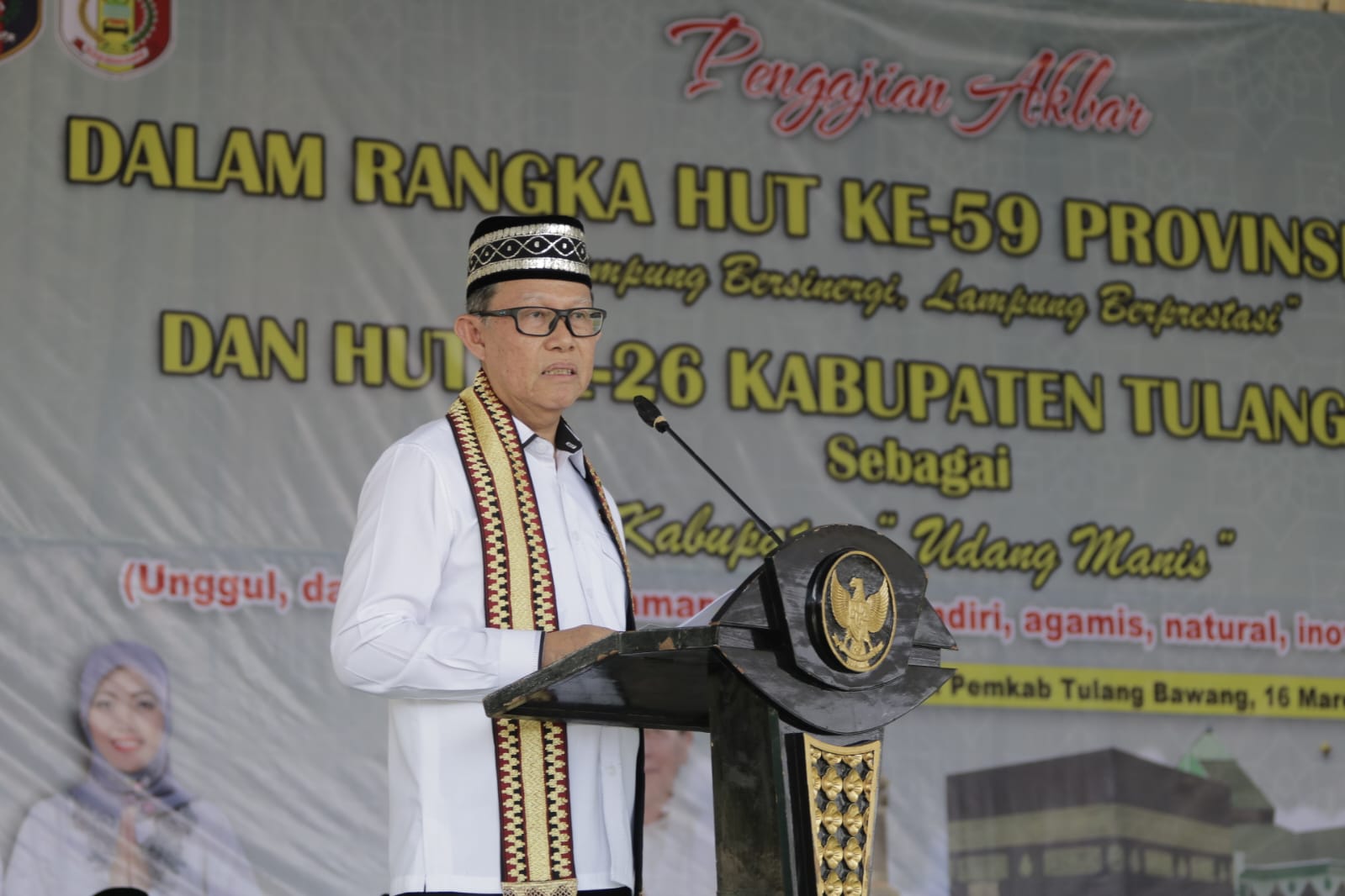 Atas nama Pemerintah Provinsi Lampung, saya mengucapkan selamat dan Dirgahayu kepada seluruh masyarakat Kabupaten Tulang Bawang. Melalui Hari Jadi ini, marilah kita jadikan momentum untuk terus berjuang dan berkarya, mengukir sejarah membangun masyarakat Tulang Bawang yang semakin berdaya saing dan sejahtera dengan mengandalkan potensi Sumber Daya Alam (SDA) dan kearifan lokal yang dimiliki.