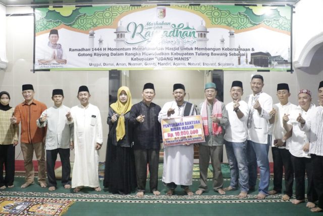 Selepas menunaikan Ibadah sholat tarawih berjamaah, Penjabat Bupati Tulang bawang Drs Qudrotul Ikhwan MM, Ketua Tim Penggerak PKK Kabupaten Tulang Bawang Herlinawati Qudrotul SH , Asisten Bidang Pemerintahan dan Kesra Dr Akhmad Suharyo M.Si serta beberapa pejabat pimpinan tinggi pratama di lingkup Pemerintah kabupaten Tulang Bawang, serta menyerahkan bantuan beras dan Hibah Pembangunan masjid senilai 10 juta Rupiah.