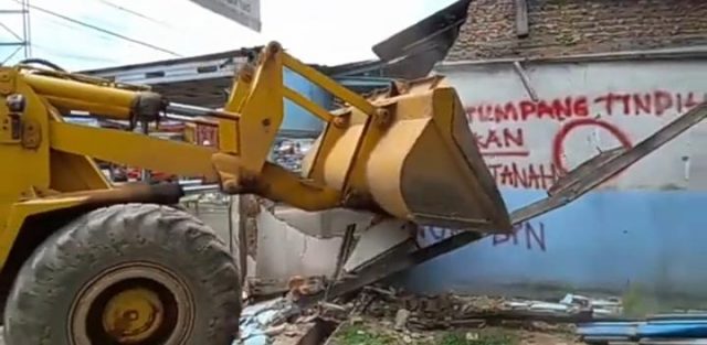 Setelah pembacaan penetapan eksekusi, dan mengeluarkan isi bangunan, Pengadilan Negri Gunung Sugih, dengan menggunakan alat berat merobohkan kios milik Purboyo.