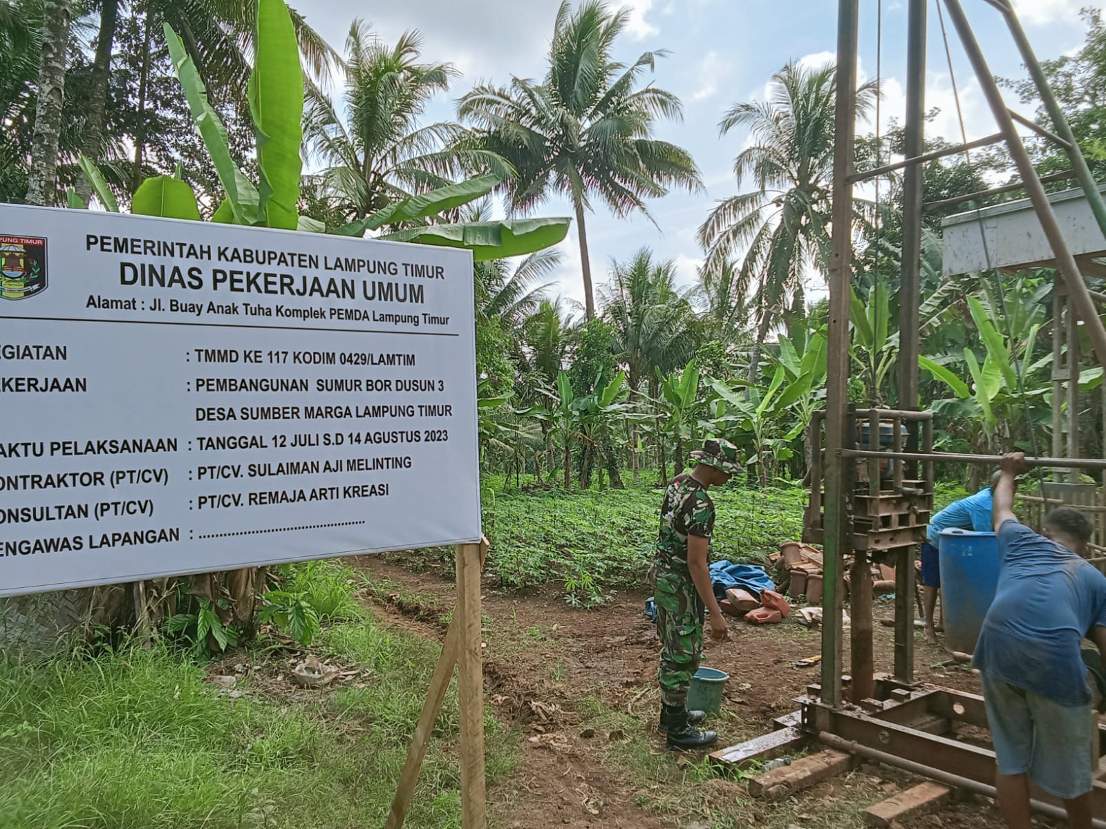 Lampung Timur,(radarnews.id)- Salah satu sasaran fisik TNI Manunggal Membangun Desa (TMMD) Reguler 117 Kodim 0429/Lamtim yang saat ini dimulai pengerjaanya yakni pembangunan sumur bor, di Dusun 3 Desa Sumber Marga, Kecamatan Way Jepara, Sabtu (15/7/2023).