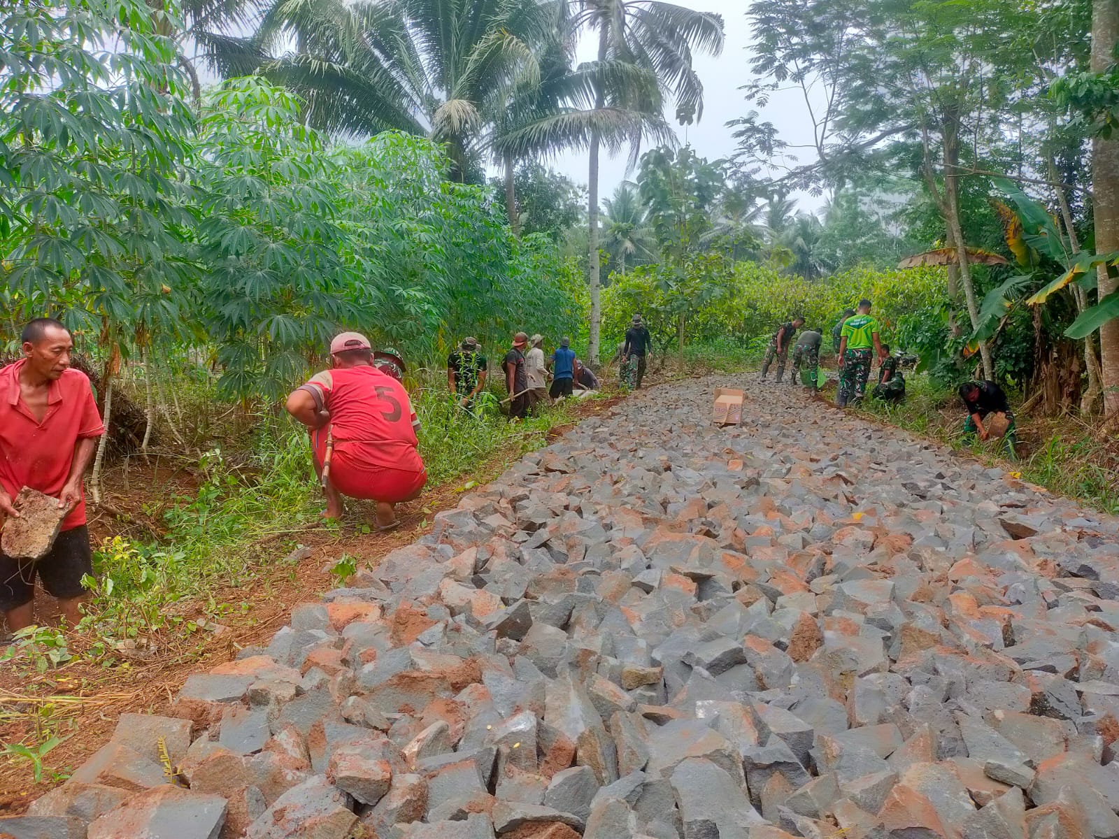 Sampai dengan hari ke-14 (Selasa, 25 Juli 2023) program TMMD ke-117, sebagian proses pengerjaan jalan sepanjang 2738 M sudah memasuki tahap pembereman samping kiri kanan jalan sebagai pengunci batu sebelum dilakukan pemadatan dengan wales.