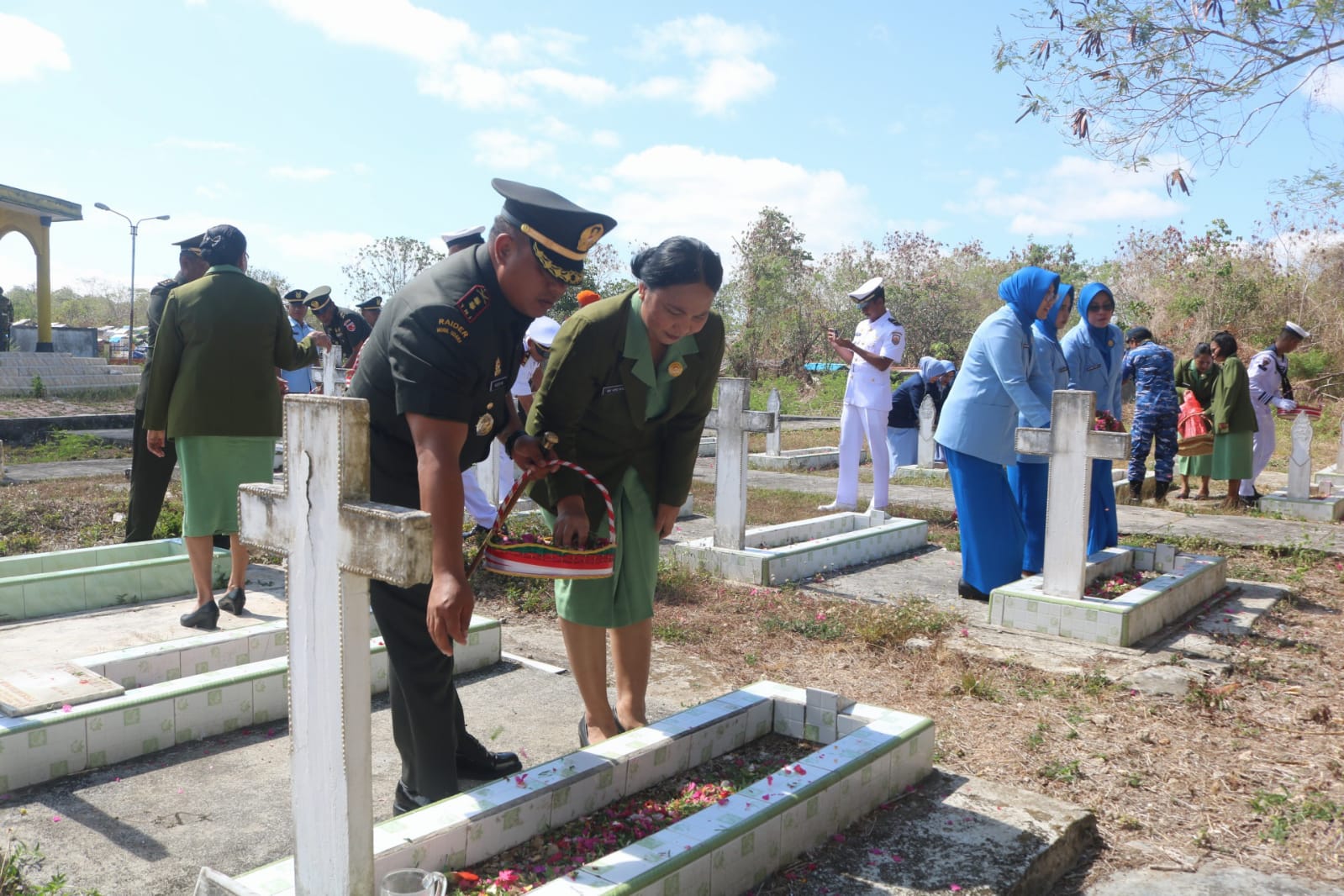 Adapun dalam kegiatan tersebut di lanjutkan dengan Penaburan bunga oleh Dandim di dampingi Ketua Persit KCK Cabang XXVI Kodim Tual beserta unsur pimpinan dari TNI AL dan TNI AU.