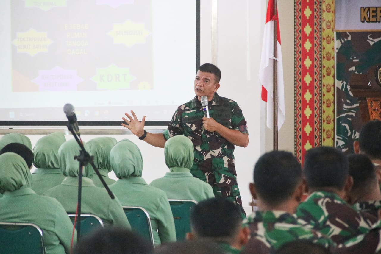 “Permohonan maaf dari Komandan Kodim tidak bisa bersama-sama mengikuti penyuluhan karena ada kegiatan di Makodam. Hari ini merupakan momen istimewa karena dengan acara penyuluhan Binroh dan Bintaljuang dapat kita jadikan landasan selaku Prajurit dan Persit dalam kehidupan sehari-hari”, ujarnya.