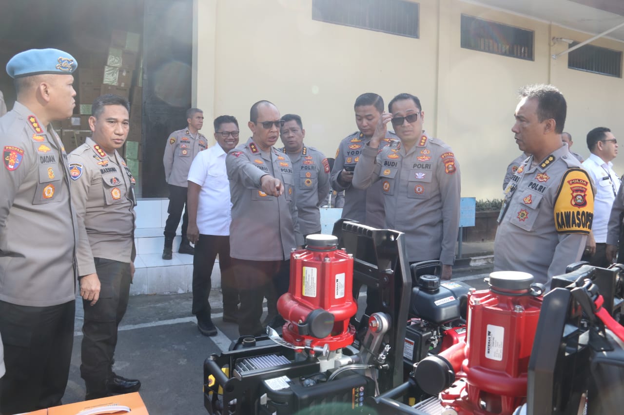 Kapolda Sumsel Irjen Pol. A. Rachmad Wibowo, S.I.K. melakukan pengecekan peralatan penanggulangan kebakaran hutan dan lahan (karhutla) di Gudang Logistik Mapolda Sumsel pada Rabu (24/7). Kegiatan ini dimulai pukul 08.30 WIB dan dihadiri oleh sejumlah pejabat utama dan personel Polda Sumsel.