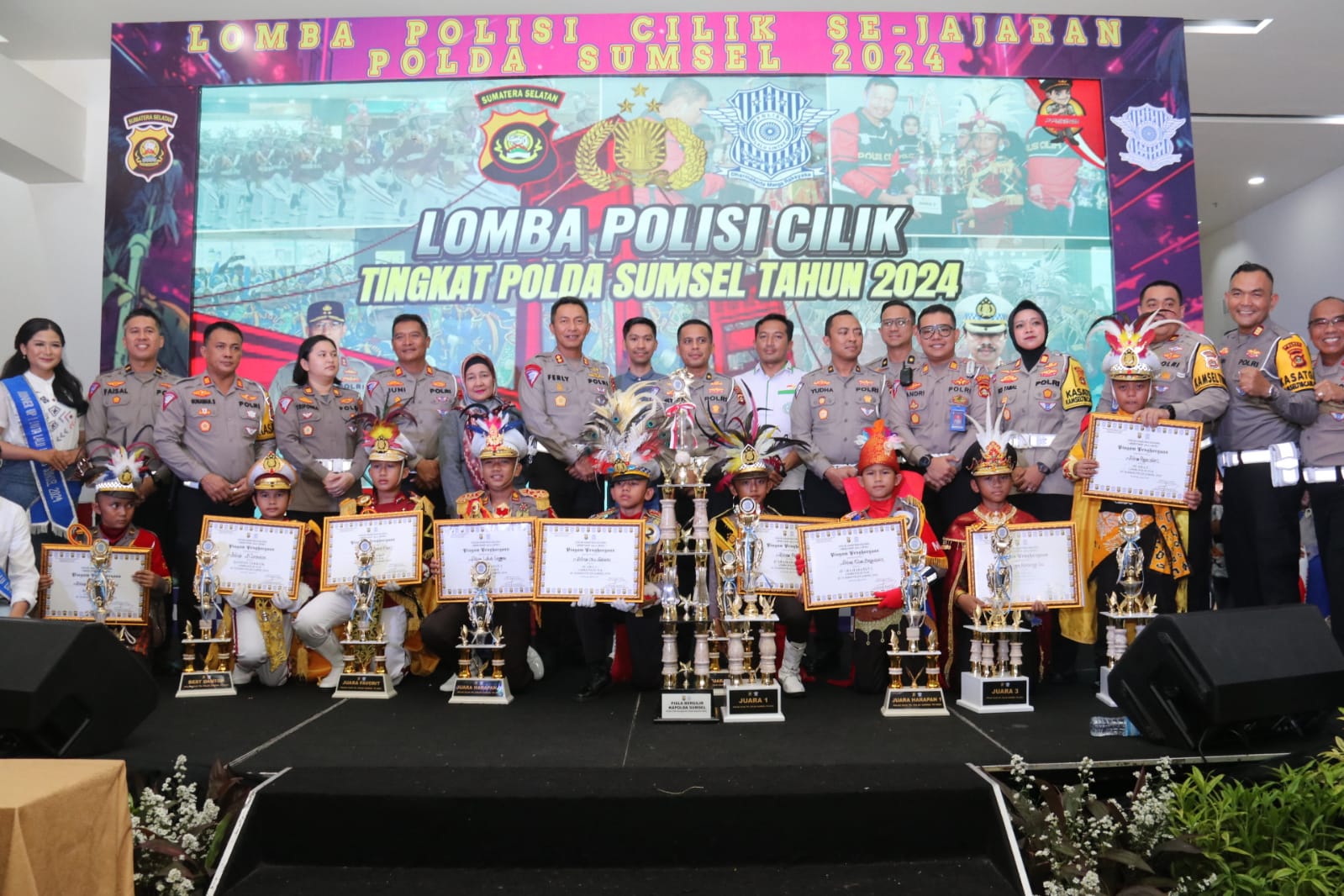 Kedua Juara dua Polres Pagaralam Ketiga Juara tiga Polres OKU,Keempat Juara harapan 1 Polres Muba Kelima Juara harapan 2 Polres Pali,keenam Juara harapan 3 Polres Lubuk Linggau.Ketujuh Favorit lomba Polisi cilik diraih oleh Polres Muara Enim.