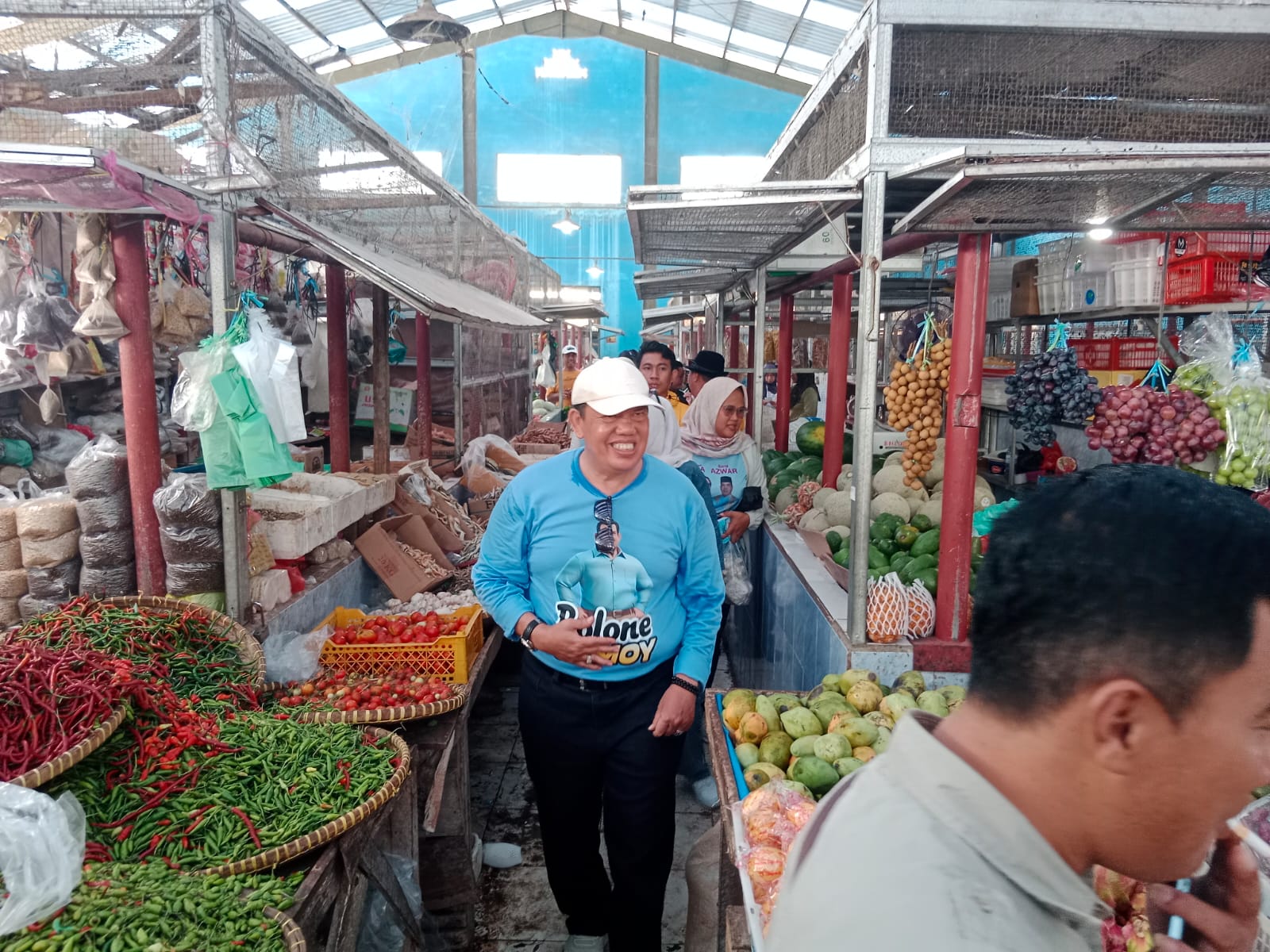 Usai menjalani senam masal, calon Wakil Bupati Lampung Timur Azwar Hadi beserta rombongan menyambangi pedagang pasar Way Jepara, Minggu (22/9/2024). Tujuan dari sambang pasar untuk mengetahui keluhan pedagang.