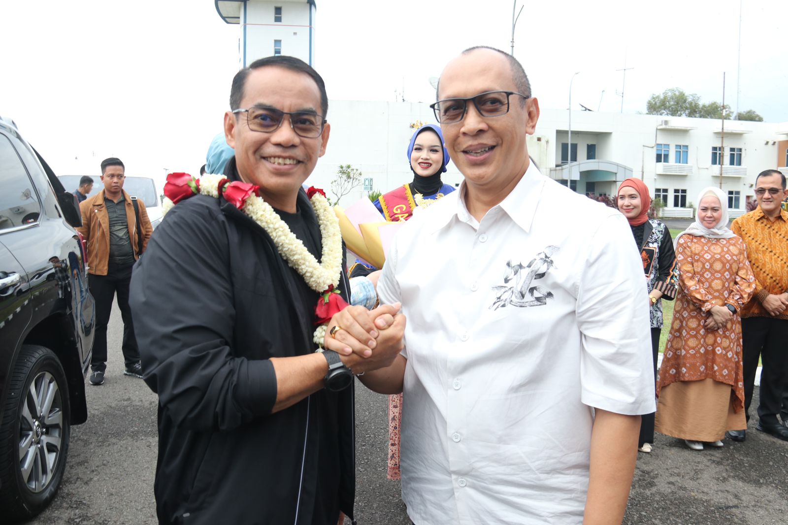 Kapolda Sumatera Selatan yang baru Irjen Andi Rian R Djajadi Sik MH beserta istri Nyonya Dewwy Andi Rian mendarat di bandara Sultan Mahmud Badaruddin II Palembang disambut pengalungan bunga oleh Waka BSSN RI yang juga mantan Kapolda Sumsel, Komjen A Rachmad Wibowo beserta istri, Panglima Kodam II Sriwijaya Mayjen TNI Naudi Nurdika dan segenap unsur Forkopimda Plus Provinsi Sumsel, Wakapolda Brigjen M Zulkarnain, Pejabat Utama Polda dan istri serta Kapolres sejajaran Polda Sumsel dan istri, pada Minggu sore (29/9/2024).