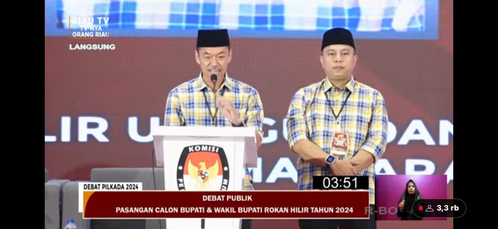 KPU Kabupaten Rohil Provinsi Riau laksanakan debat publik paslon Bupati dan Wakil Bupati Rohil periode Tahun 2024, dengan tema” Sumber Daya Manusia Handal, Ekonomi Kuat, Rokan Hilir Sejahtera di Hotel The Zuri, Pekanbaru Provinsi Riau, Selasa 12/11/2024, Pukul 20.00 Wib.