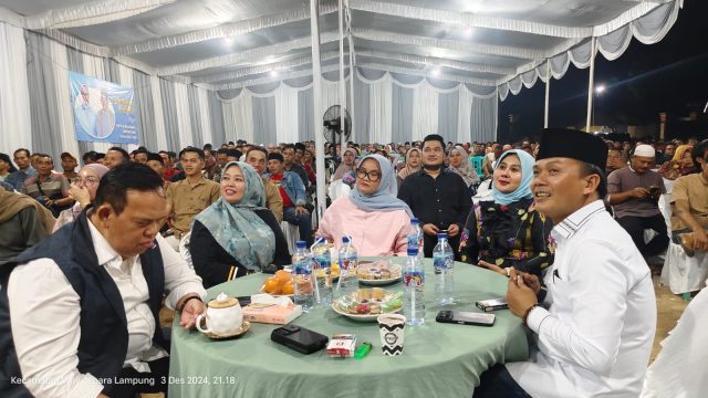 Ribuan masyarakat Kecamatan Way Jepara, Kabupaten Lampung Timur, berbondong-bondong menghadiri acara Tsakuran kemenangan pasangan nomor 1 Ela-Azwar yang diselenggarakan oleh Tim Pemenganan di kediaman Heri NJA, tepatnya di Desa Labuhan Ratu Satu, Selasa (3/12/2024).