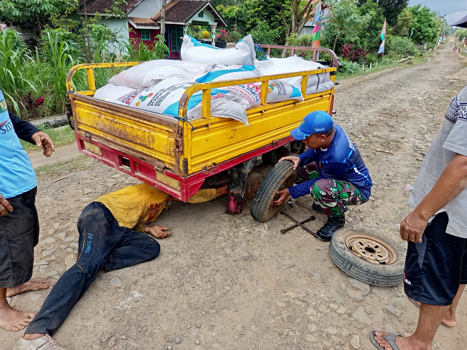 “Ternyata bentor yang membawa pupuk tersebut tidak ada dongkraknya sehingga Pak Katiman menunggu sampai ada yang melintas. Pas kebetulan saya melintas kemudian ada dongkrak jadi ban bisa diganti lalu melanjutkan perjalanan”, imbuh Koptu Budi.