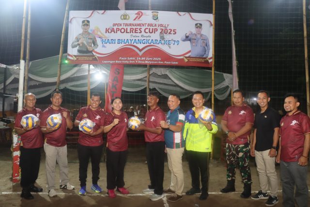 Open turnamen volly ball Kapolres Cup digelar dalam rangka memeriahkan Dirgahayu Bhayangkara ke-79, bertempat di Dusun 4, Desa Mulyosari, Kecamatan Pasir Sakti, Kabupaten Lampung Timur, Selasa Malam (24/6/2025).