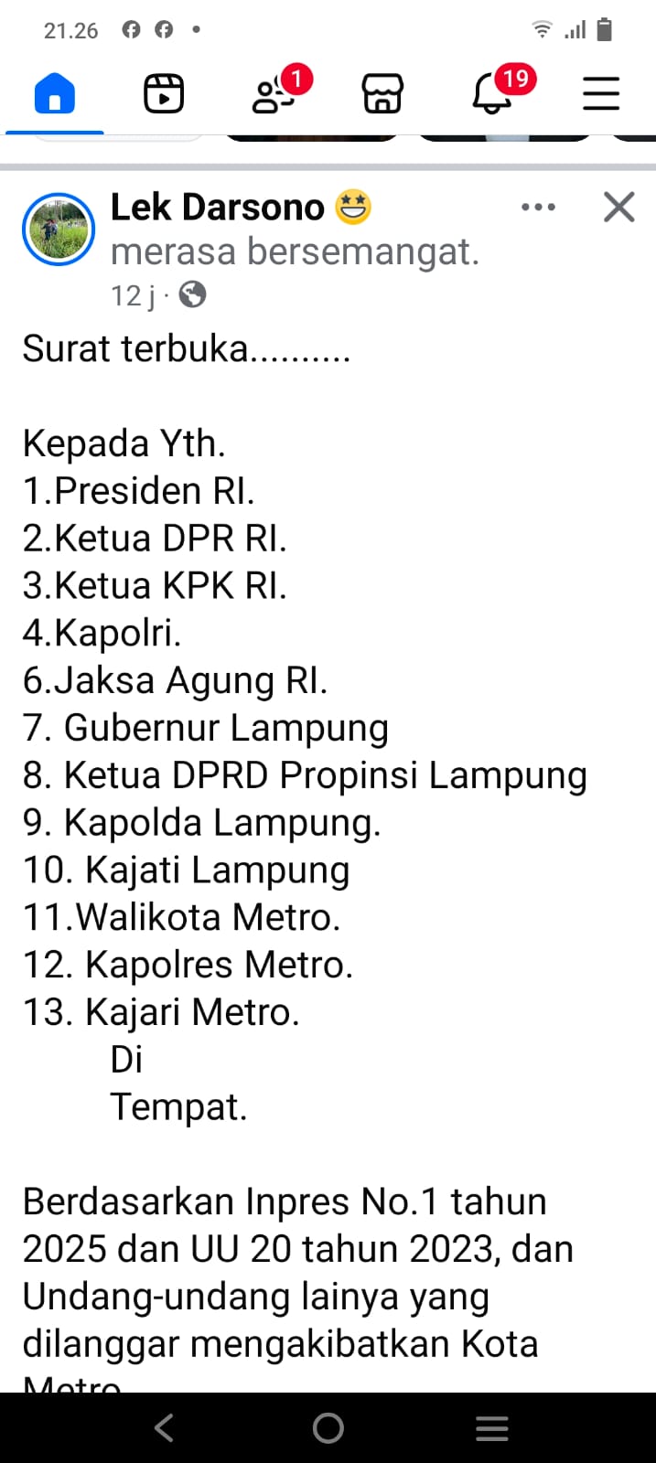 Surat terbuka yang di buat anggota DPRD Kota Metro dari Partai Gerindra ini melalui media sosial Facebook pada tanggal 10 Juli 2025 yang di tujukan kepada Presiden RI, Ketua DPR RI, Ketua KPK RI, Kapolri, Jaksa Agung RI, Gubernur Lampung, Ketua DPRD Provinsi Lampung , Kapolda Lampung, Kejati Lampung, Walikota Metro, Kapolres Metro dan Kajari Metro.