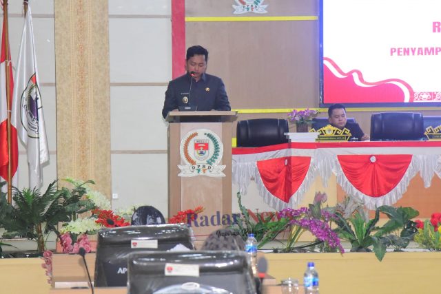 Acara tersebut juga diisi dengan penyampaian jawaban Bupati atas pandangan umum fraksi, berlangsung di Ruang Paripurna Kantor Dewan Perwakilan Rakyat Daerah (DPRD) Kabupaten Mesuji, Kamis (19/06/25).