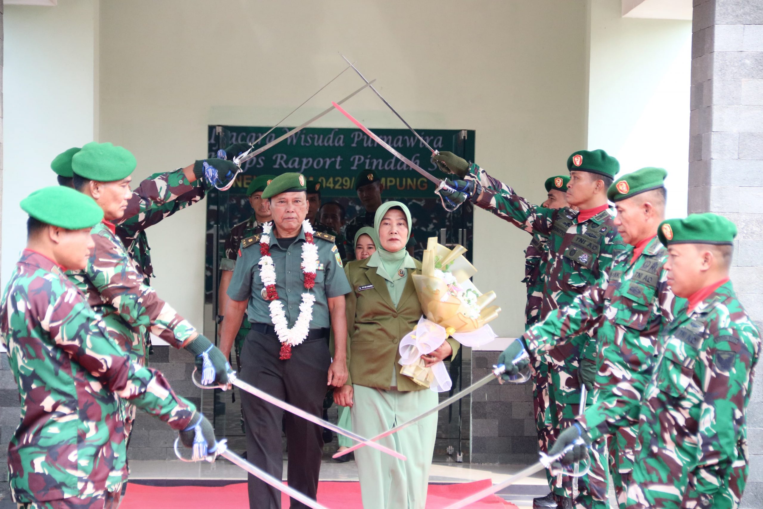 Dandim 0429/Lamtim Letkol Inf Danang Setiaji, S.I.P pimpin Upacara Wisuda Purnawira dan Korps Raport Pindah Satuan bertempat di Aula Gatot Subroto Makodim, Kamis (24/7/2025).