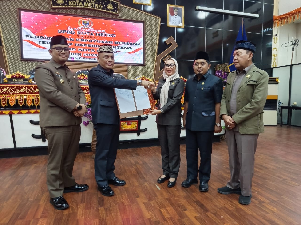 Rancangan Peraturan Daerah (Raperda) tentang Rencana Pembangunan Jangka Menengah Daerah (RPJMD) Kota Metro Tahun 2025–2029 resmi disahkan menjadi Peraturan Daerah (Perda) dalam Rapat Paripurna DPRD Kota Metro yang digelar di ruang sidang paripurna gedung DPRD Kota setempat Rabu, (6/8/2025).