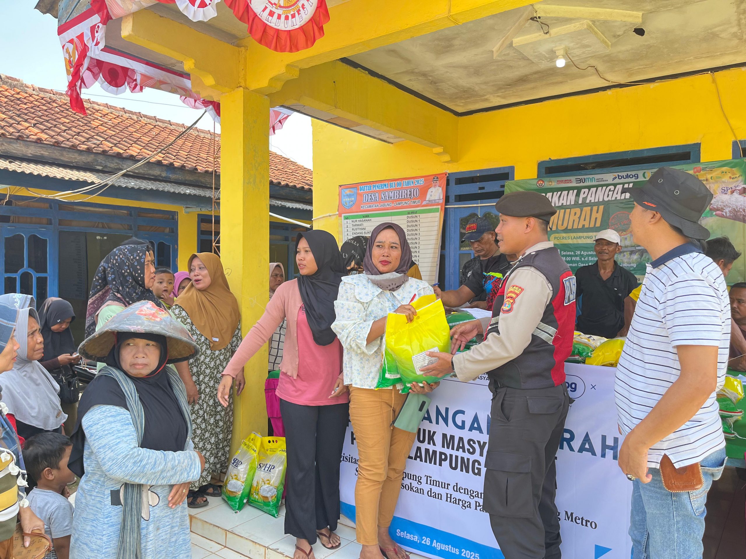 Polsek Jabung Polres Lampung Timur bersama pemerintah desa melaksanakan kegiatan Gerakan Pangan Murah (GPM) yang dipusatkan di Balai Desa Sambirejo, Kabupaten Lampung Timur, Selasa (26/8/25).
