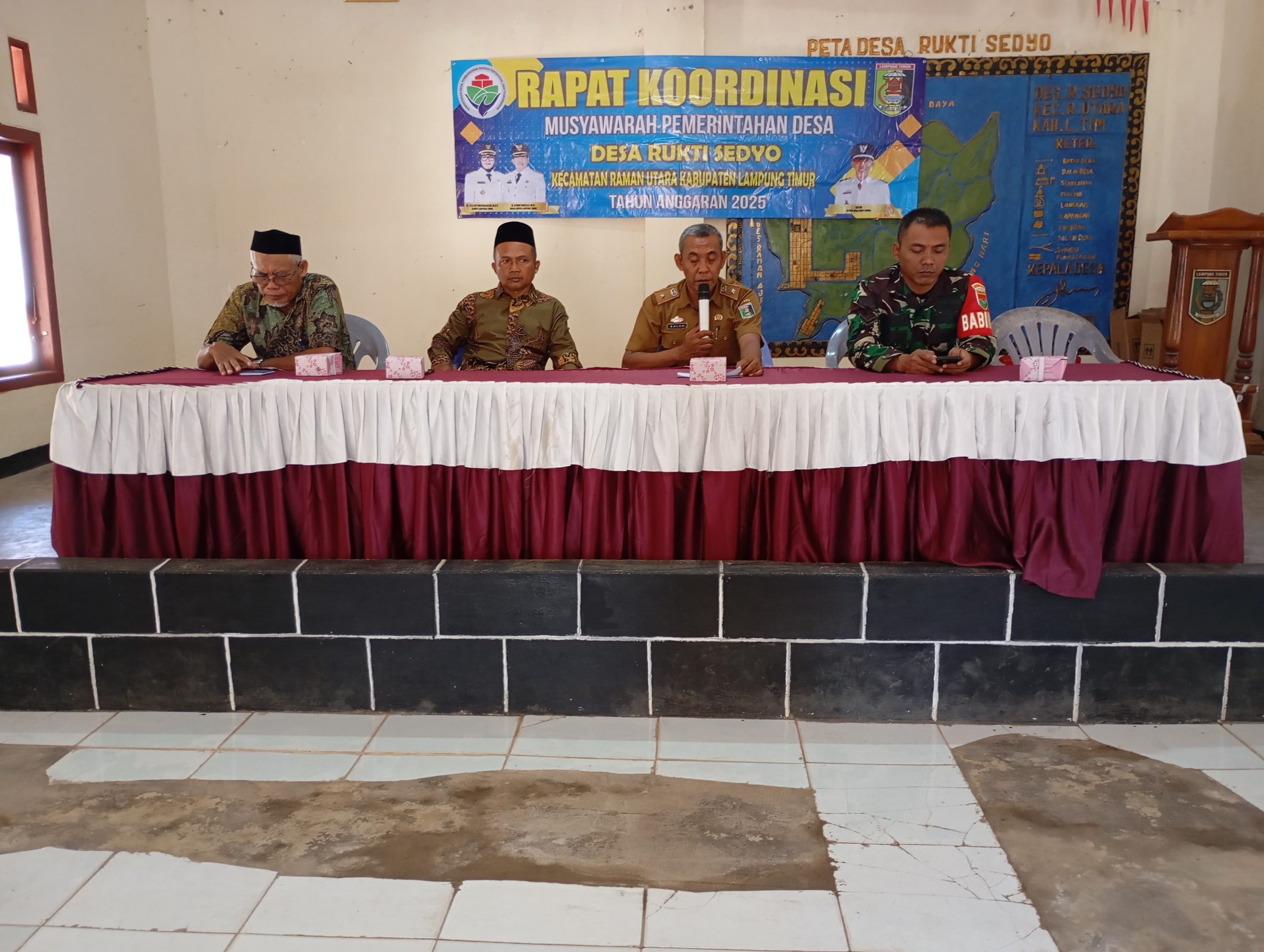 Babinsa Koramil 429-08/Raman Utara Kodim 0429/Lamtim Serda Wasito menghadiri kegiatan rapat koordinasi musyawarah pemerintahan desa, bertempat di Balai Desa Rukti Sedyo, Kecamatan Raman Utara, Kab. Lampung Timur, Senin (3/11/2025).