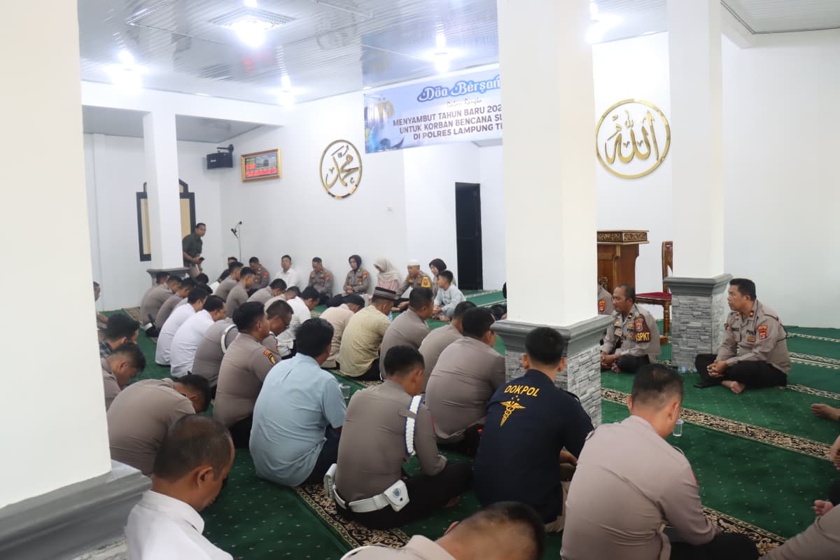 Dalam rangka menyambut Tahun Baru 2026, Polres Lampung Timur melaksanakan kegiatan doa bersama sebagai bentuk refleksi dan ungkapan rasa syukur, sekaligus mendoakan para korban bencana alam yang terjadi di wilayah Sumatera. Kegiatan tersebut berlangsung khidmat di Masjid Al Kautsar Polres Lampung Timur, Rabu sore (31/12/2025).